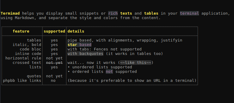 Terminad is a really interesting approach to rendering markdown in the CLI. It deliberately doesn't render links, so you can always see both the link text and the URL.