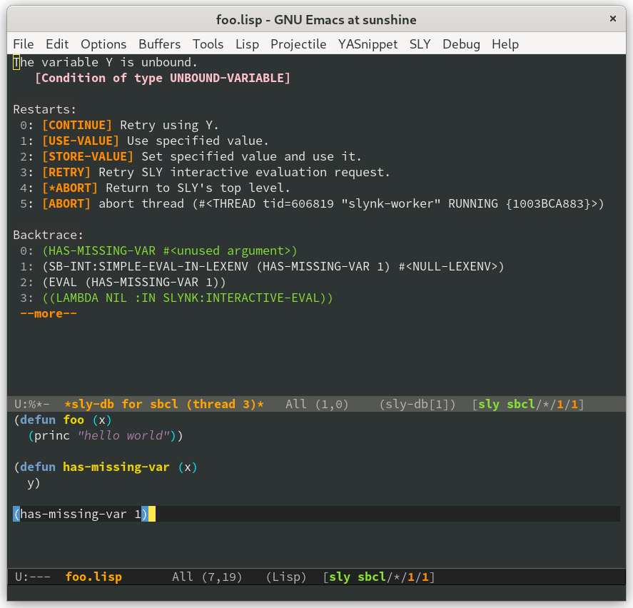 I'm impressed by how many options I'm offered in Common Lisp (in this case sbcl on Sly) for a simple error like an invalid variable name!