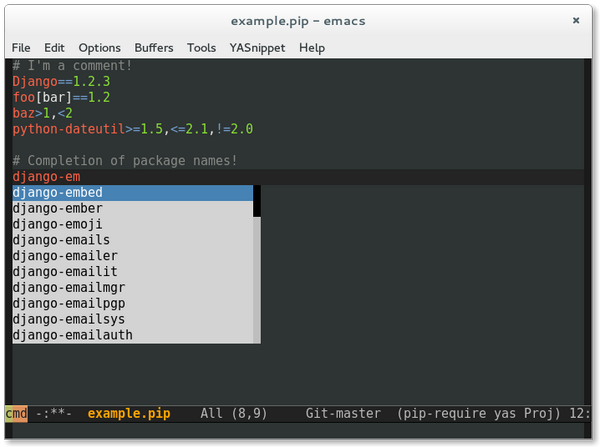 If you use Emacs for Python, pip-requirements will now auto-complete package names! https://github.com/Wilfred/pip-requirements.el http://t.co/gB3oe5b2ZJ