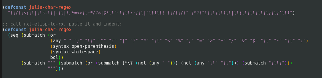 pcre2el has this awesome feature that converts huge emacs regexps into rx forms. It's indispensable. http://t.co/1Y2ZauUOXi