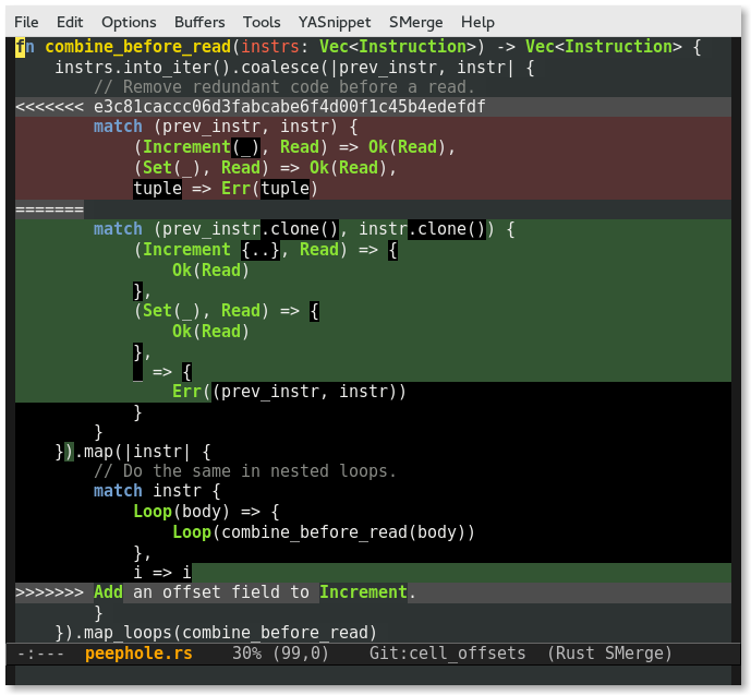 Today's Emacs tool: smerge. It highlights conflicts, differences and provides smerge-keep-current to choose between. http://t.co/hyO15HKAOl