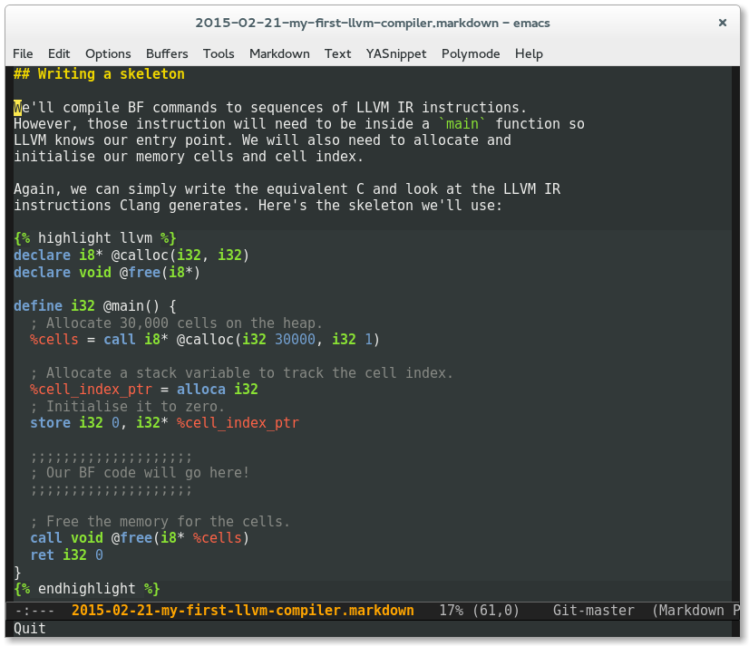 Discovered jekyll-modes today, a major mode with syntax highlighting in highlight blocks when editing Jekyll posts. http://t.co/7FeQyFgICe