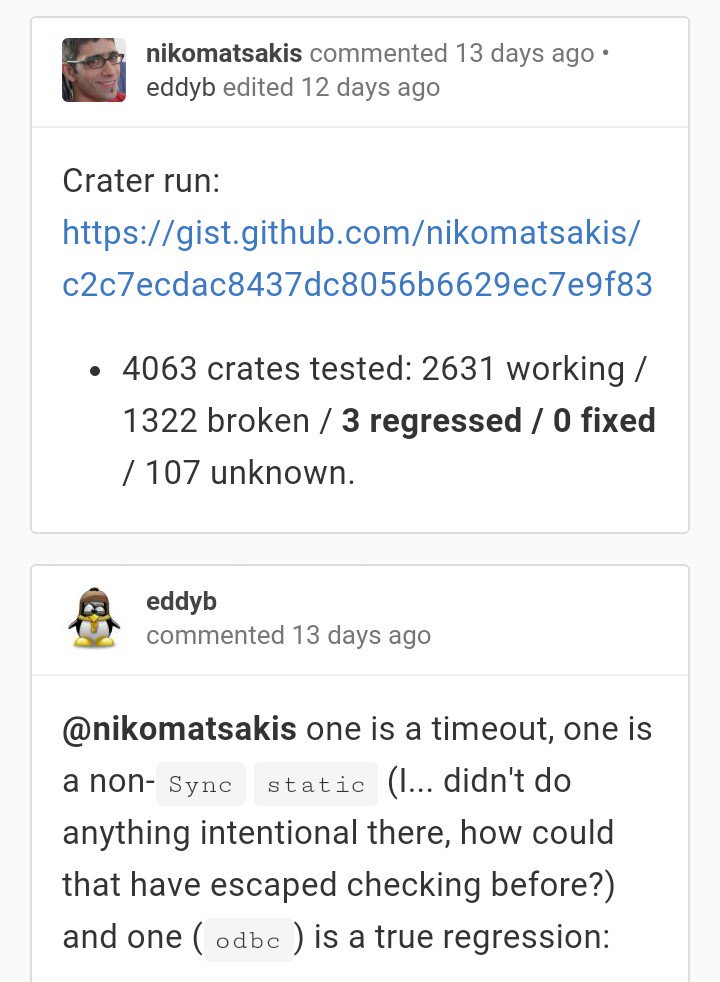 Rust's crater is also neat. Here's an example of fixing a compiler issue and rebuilding public packages to test it.
