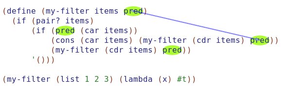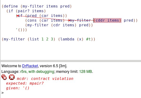 Playing with Dr Racket today. It has some really cute highlighting for stack traces and symbol definitions.