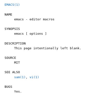 Plan 9's man page for Emacs is a little understated. (From https://man.cat-v.org/plan_9/1/emacs )