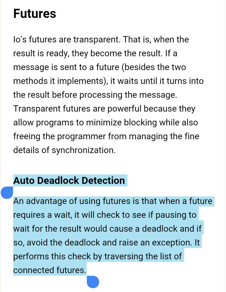 Futures in Io automatically check to see if they're causing a deadlock! Impressive.