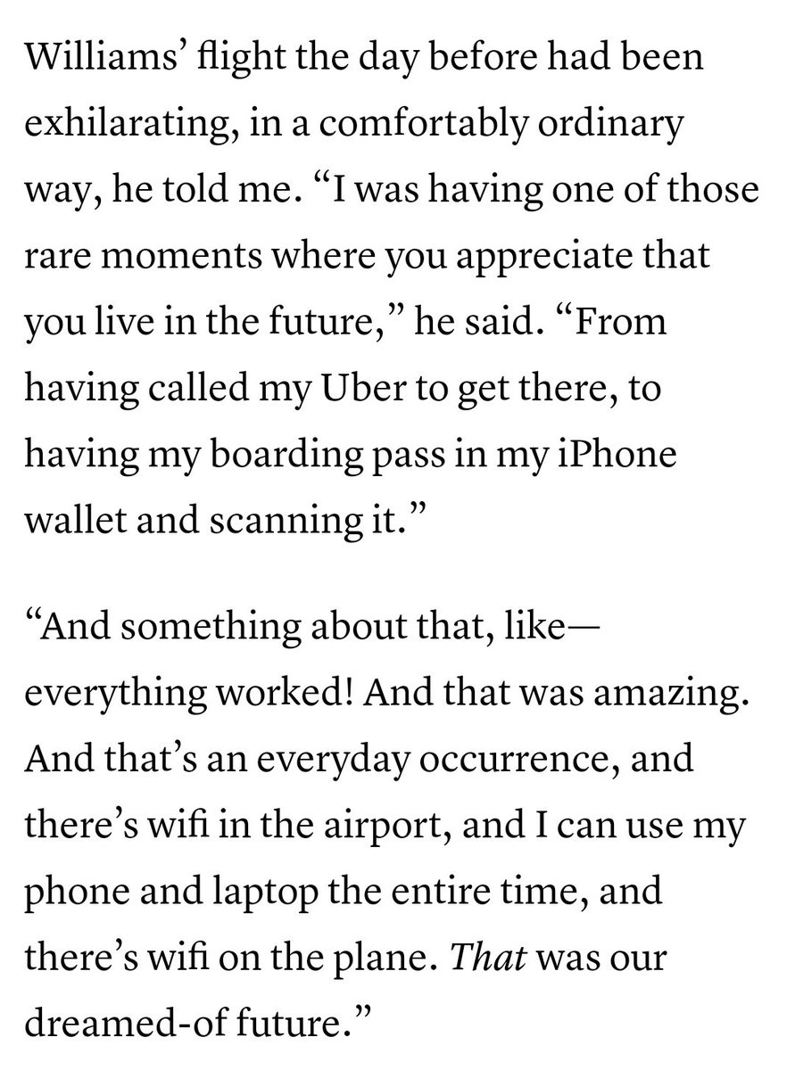 Great point: the big difference between futuristic visions and their results is often how well things work.