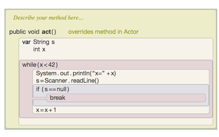 An elegant way of showing syntax of break in while loops! (Greenfoot screenshot from https://docs.google.com/presentation/d/1MD-CgzODFWzdpnYXr8bEgysfDmb8PDV6iCAjH5JIvaI/pub?start=false&loop=false&delayms=3000&slide=id.g1d7c11dd1b_0_304 )