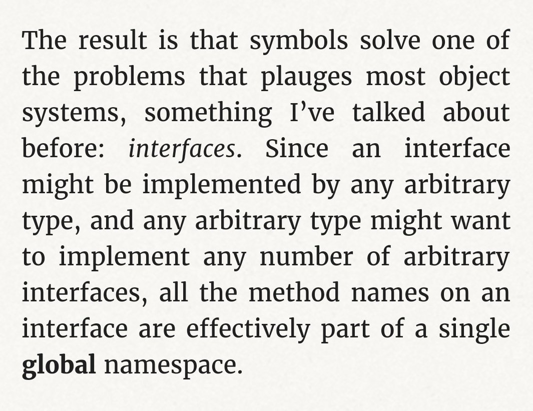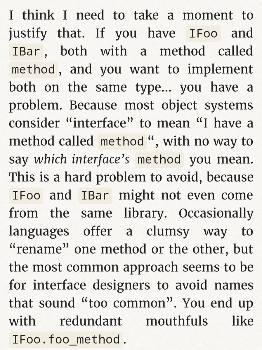 Interfaces are a great way of grouping methods, but many PLs struggle with method name overlaps in unrelated ifaces.