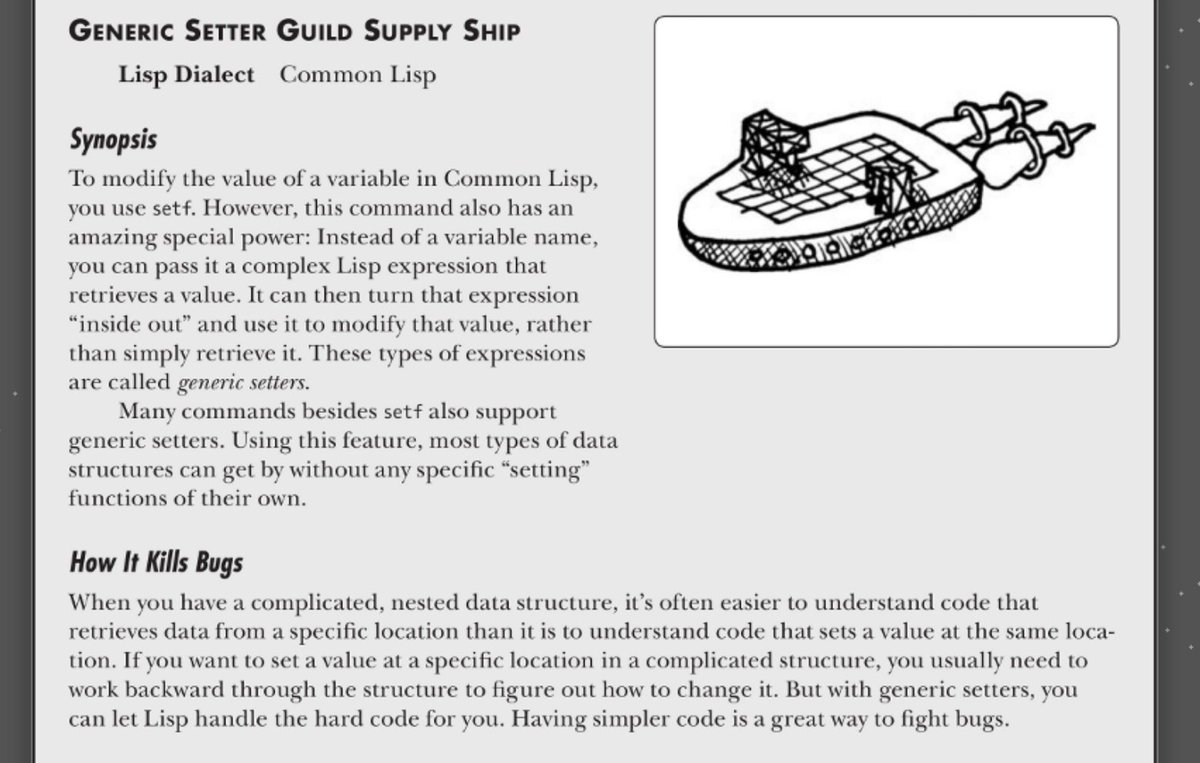 https://landoflisp.com/ describes every Lisp feature in terms of how it prevents bugs. This is a great practice in many situations!