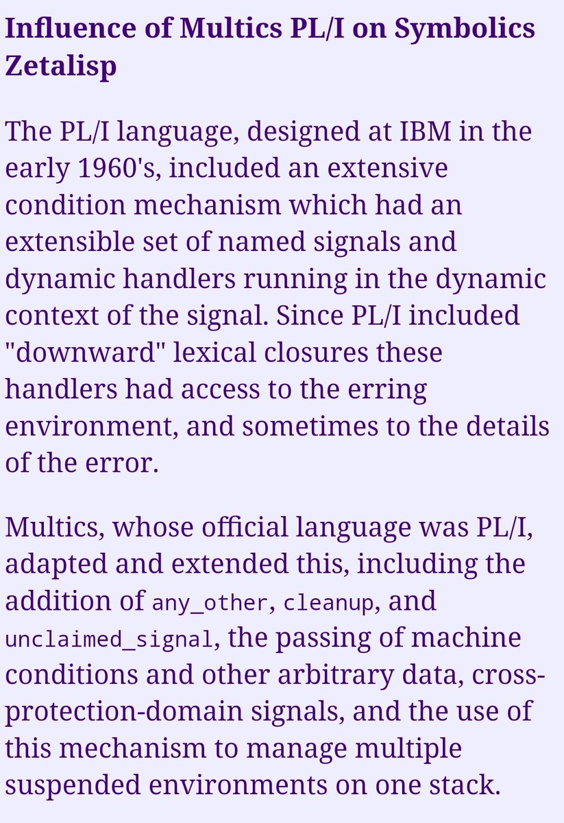 I am fascinated to learn that Multics (the Unix predecessor) was a big influence on the lisp condition system (i.e. resumable exceptions)!