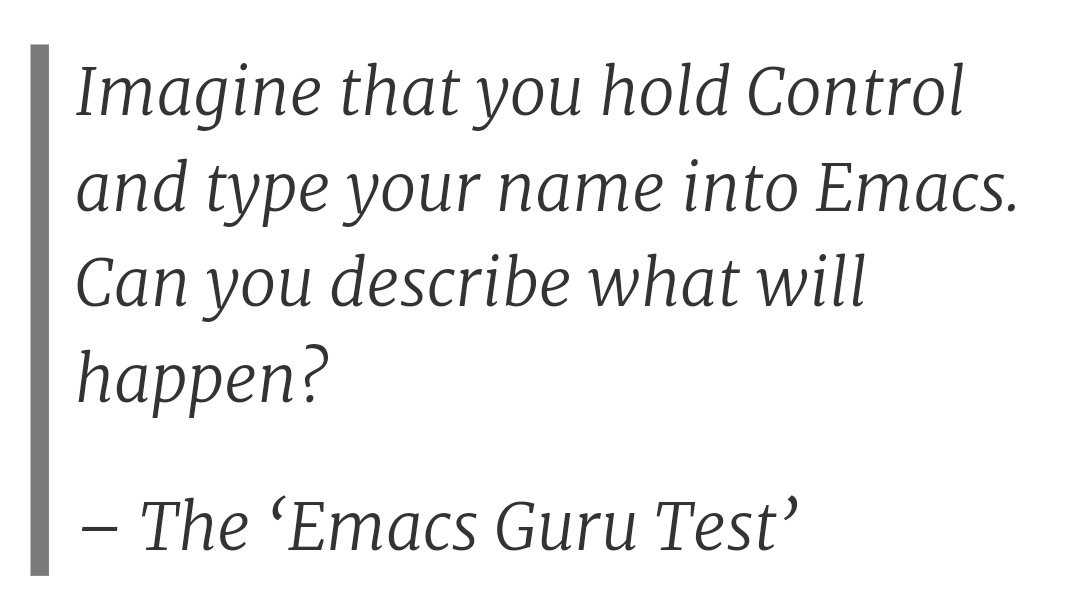 In my blog post about Emacs keybindings https://www.wilfred.me.uk/blog/2018/01/06/the-emacs-guru-guide-to-key-bindings/ I mention the 'Emacs Guru Test'.