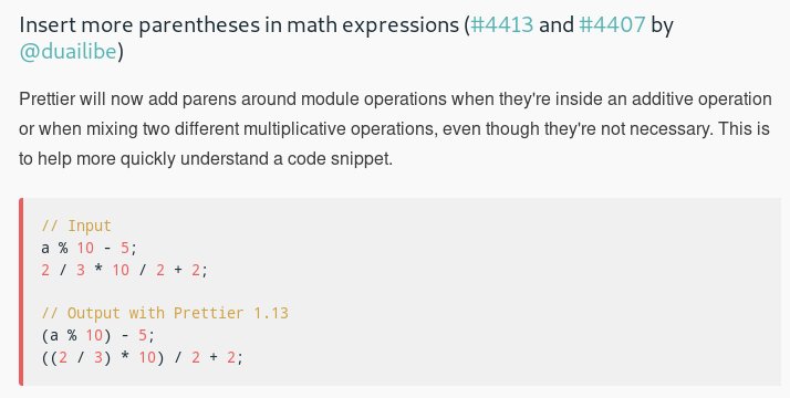 Prettier 1.13 has had a ton of polish, but this feature really caught my eye: it explicitly adds parentheses to arithmetic operations, to avoid confusion regarding precedence!
