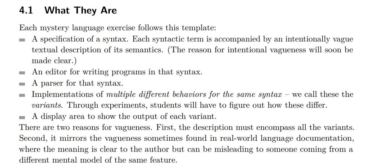 A fascinating approach to teaching programming paradigms. Implement different language semantics in the same syntax, and ask students to write programs that distinguish between them!