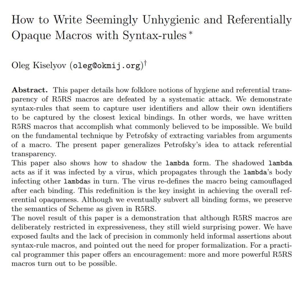 Opaque Macros with Syntax-rules: a fun paper on macros in Scheme, and how you can subvert hygiene using only syntax-rules!