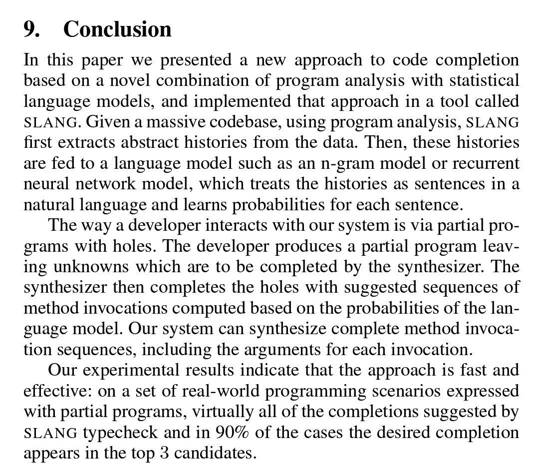 This amazing paper trains a language model on a Java corpus, then builds a code completion tool that can write whole snippets of code!