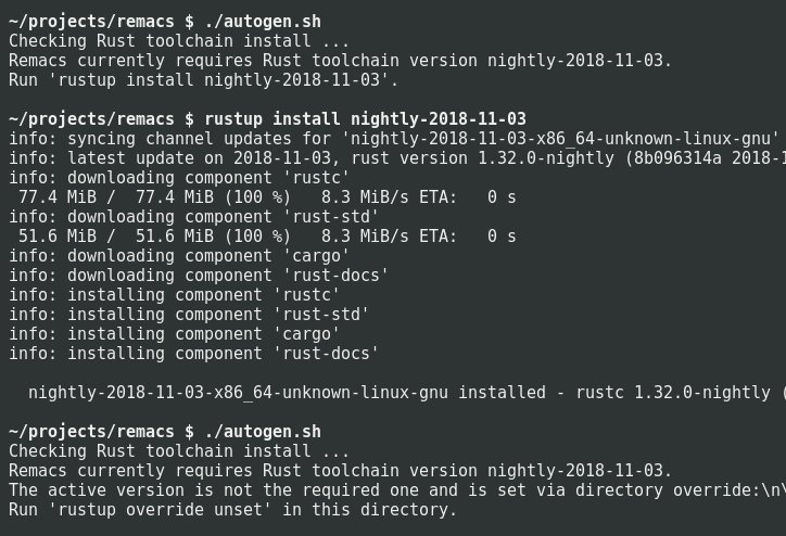 It's easy to use lots of different versions of Rust nightly. Remacs requires a specific version. The https://autogen.sh/ scripts are admirably defensive, to help you get on the right version!