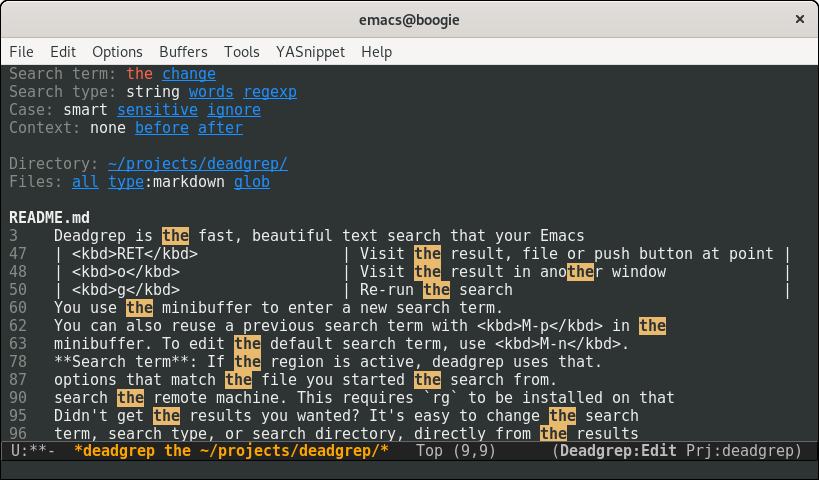 It's now possible to edit results buffers inside deadgrep! This has been a much requested feature. https://github.com/Wilfred/deadgrep/issues/12
