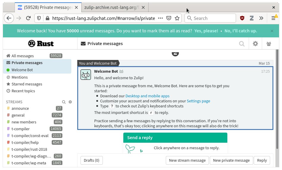 Zulip has some really nice onboarding features. You get a private thread to learn the UI, and it helpfully lets you ignore any unread messages.