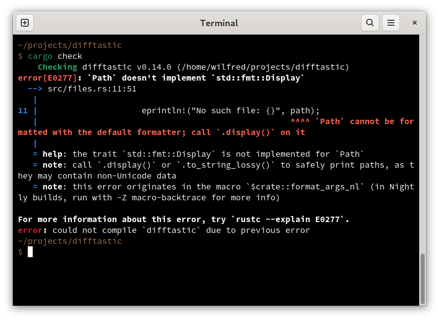 Reporting a type error is fairly straightforward: making a good suggestion of how to fix it is much harder. I was really impressed with rustc's handling of Path printing here.