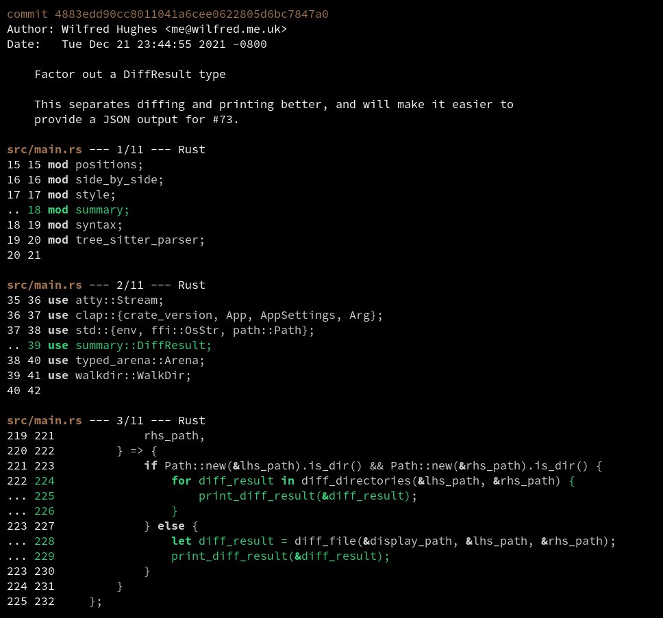 Difftastic 0.14 is out! https://crates.io/crates/difftastic In this release: * Language detection is much smarter, even understanding things like `#!/usr/bin/env python` * Better Windows support * Several crashes have been fixed