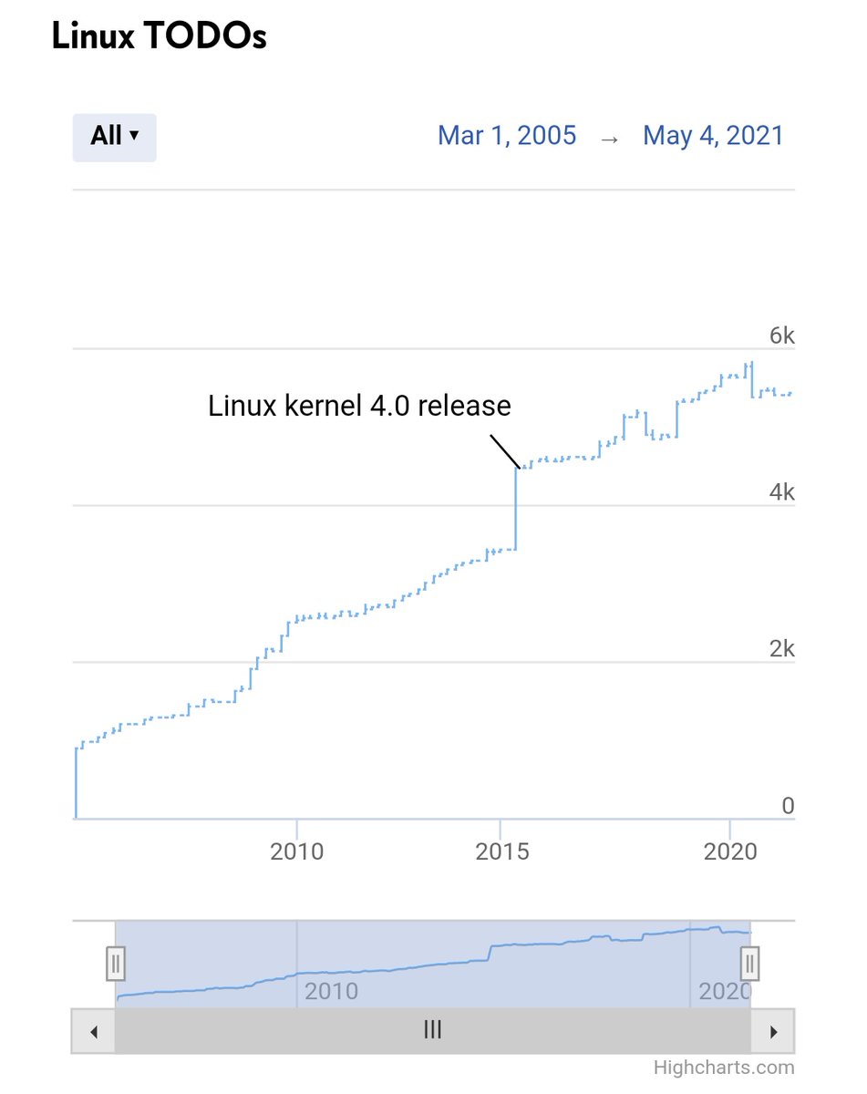 Plotting TODOs over time for different OSS projects is a really interesting way to look at project development: https://schleiss.io/plotting-source-code-todos-for-open-source-projects