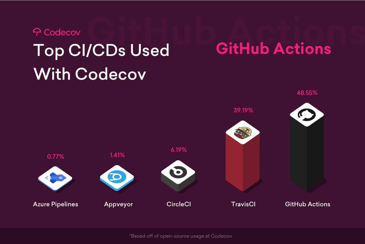 Codecov has published a bunch of interesting statistics about CI! Ruby has the highest average coverage, GH Actions is already the biggest CI provider, and 13% of projects have 100% coverage.