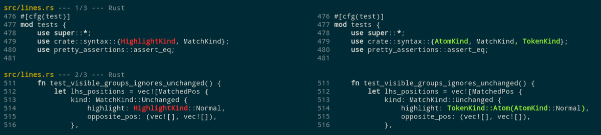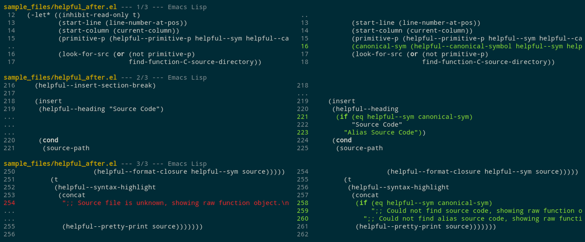 Here's how it looks in difftastic. I worry that it's slightly distracting, but I love how it makes small changes easier to spot (e.g. line 43 in the screenshot).