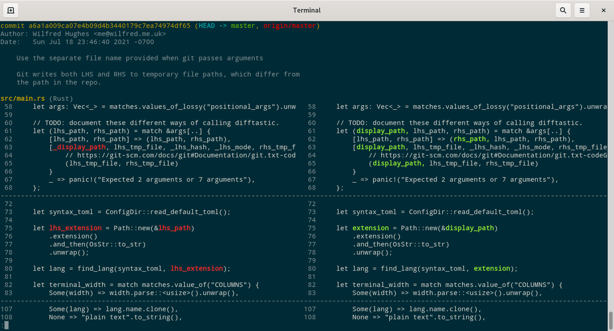 I've released difftastic 0.5! It now works with arbitrary git commands, which makes it far more useful.