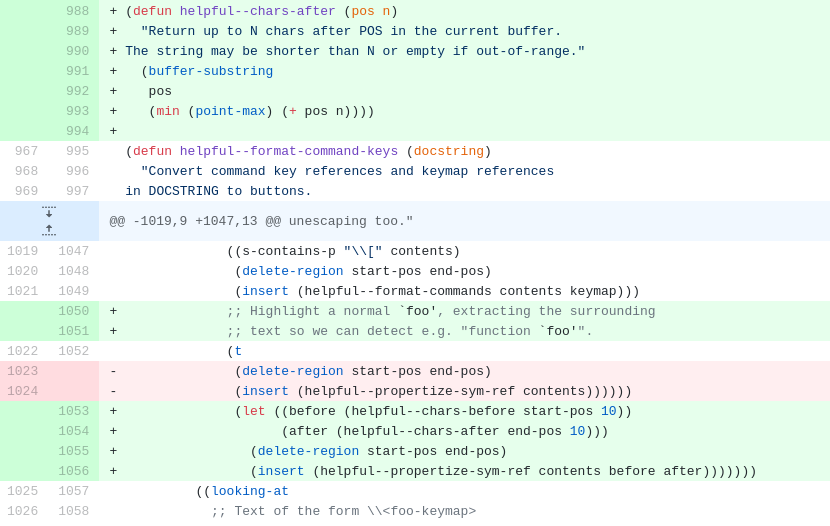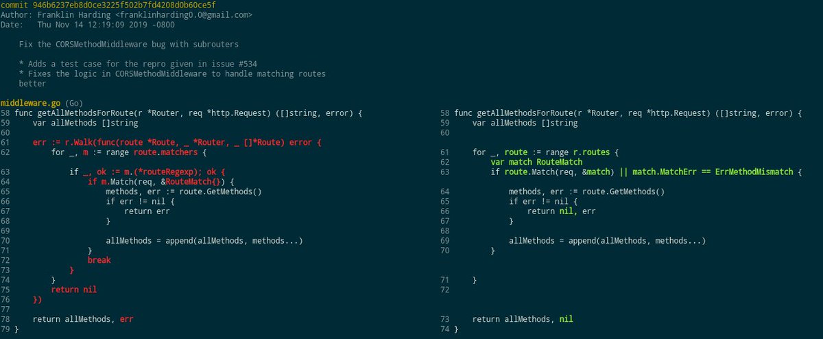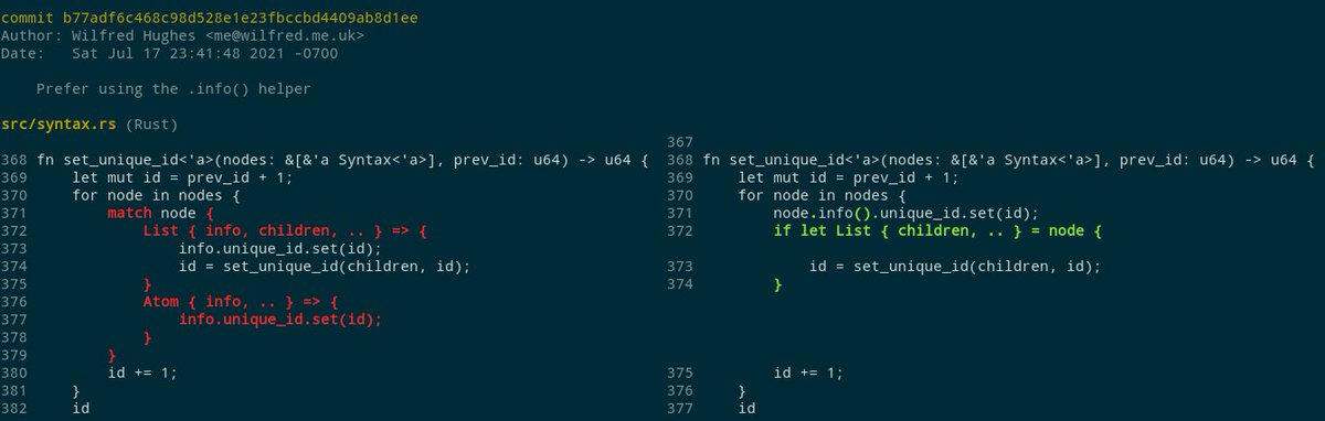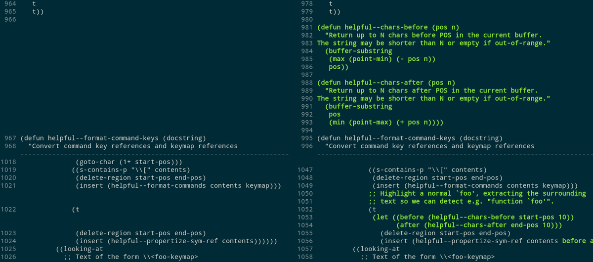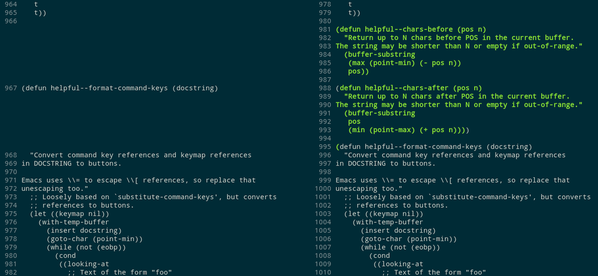 I'm still trying to get a good solution for side-by-side display in difftastic. I'm experimenting with .. for line numbers, so it's more obvious when a hunk begins and ends.