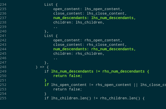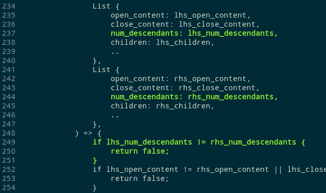 It works amazingly well! Note how it recognises both parent and children unchanged nodes in the lisp example. You can even see me refactoring Rust to use if-let.