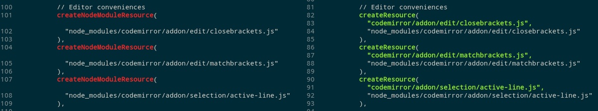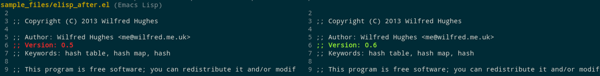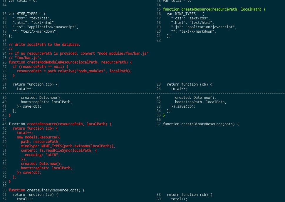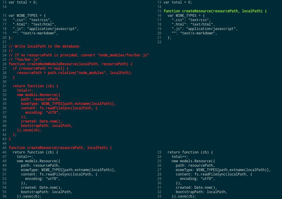 Here's a nice example from optimisation today: I've removed an outer if statement. Note that it's lined up line 47 on the left with line 41 on the right, even though they have different indentation.