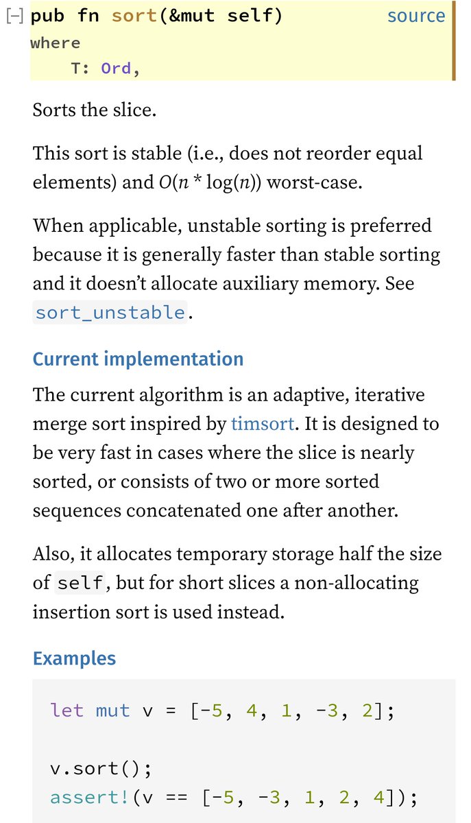 The examples coverage in Rust is exceptionally good. It's weird how few languages include an example in their stdlib docs for sorting.
