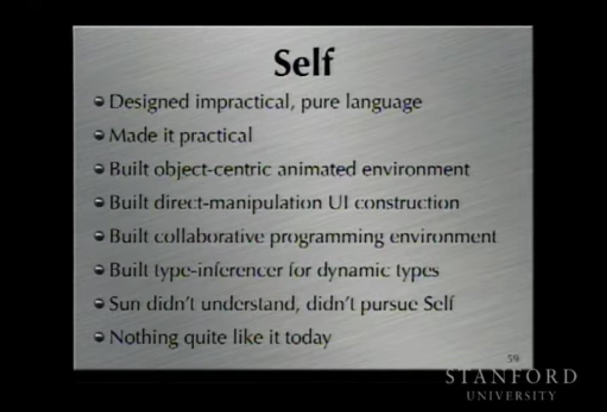The Self programming language, the optimisation techniques they pioneered, and the emergent design principles: https://youtube.com/watch?v=3ka4KY7TMTU