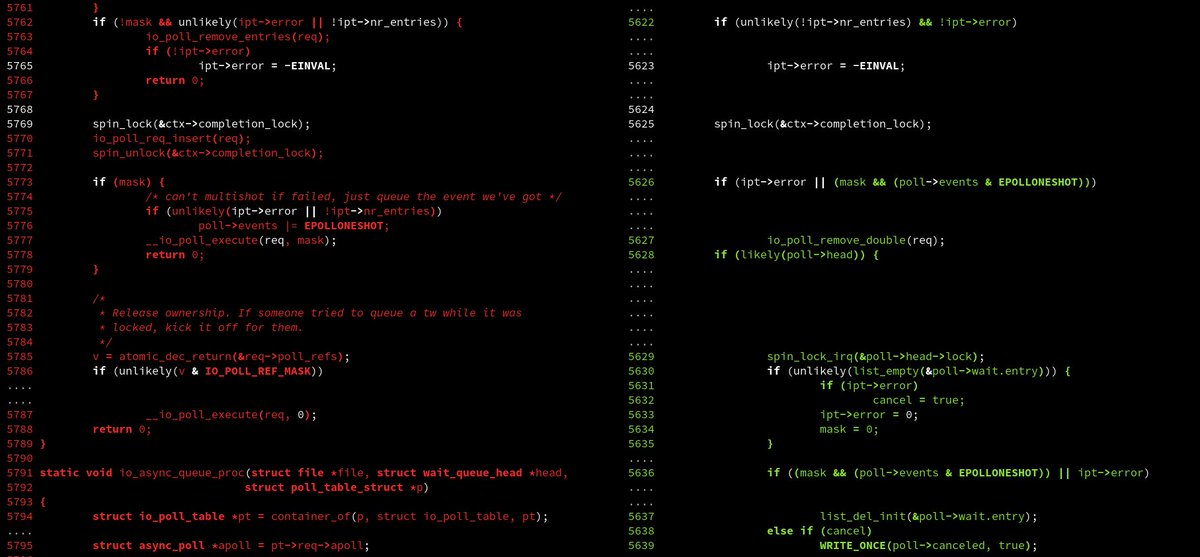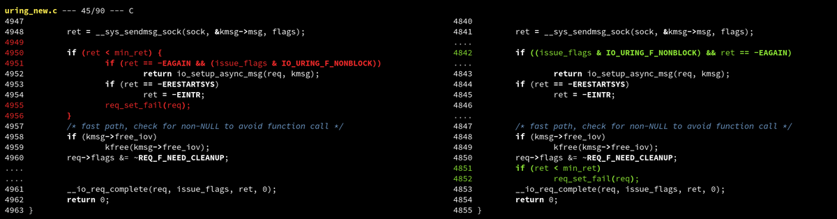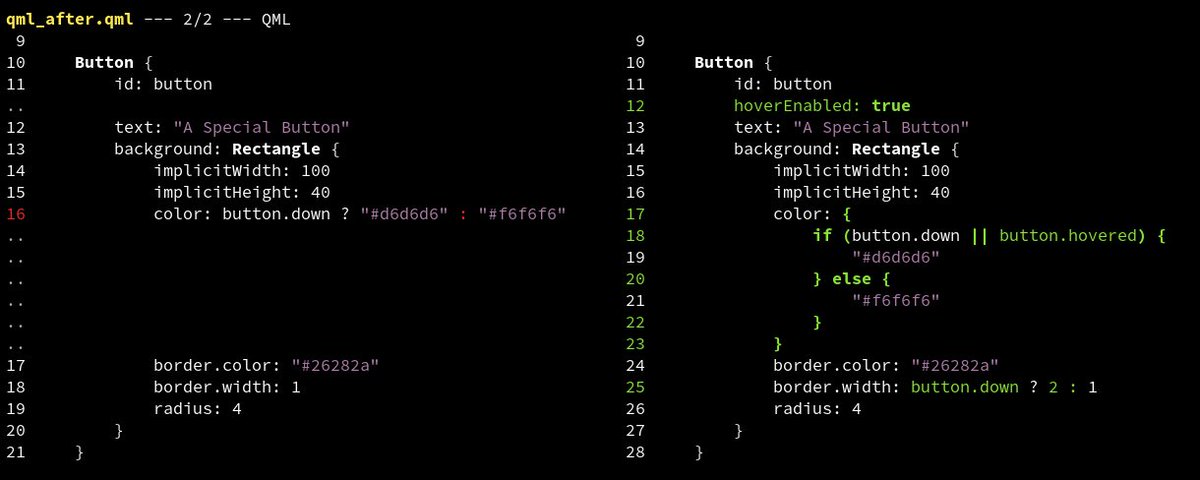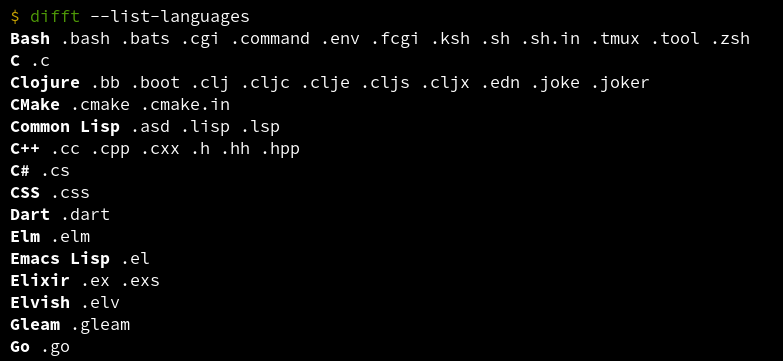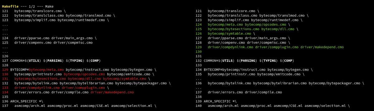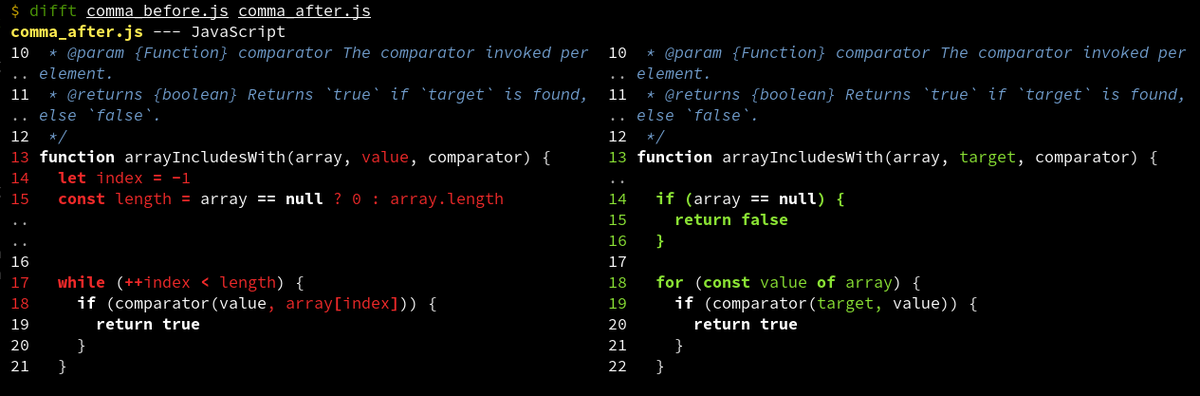 Difftastic works really hard to find similarities between the before and after file. Sometimes this works wonderfully (see first screenshot) and sometimes it goes way too far (see second screenshot).