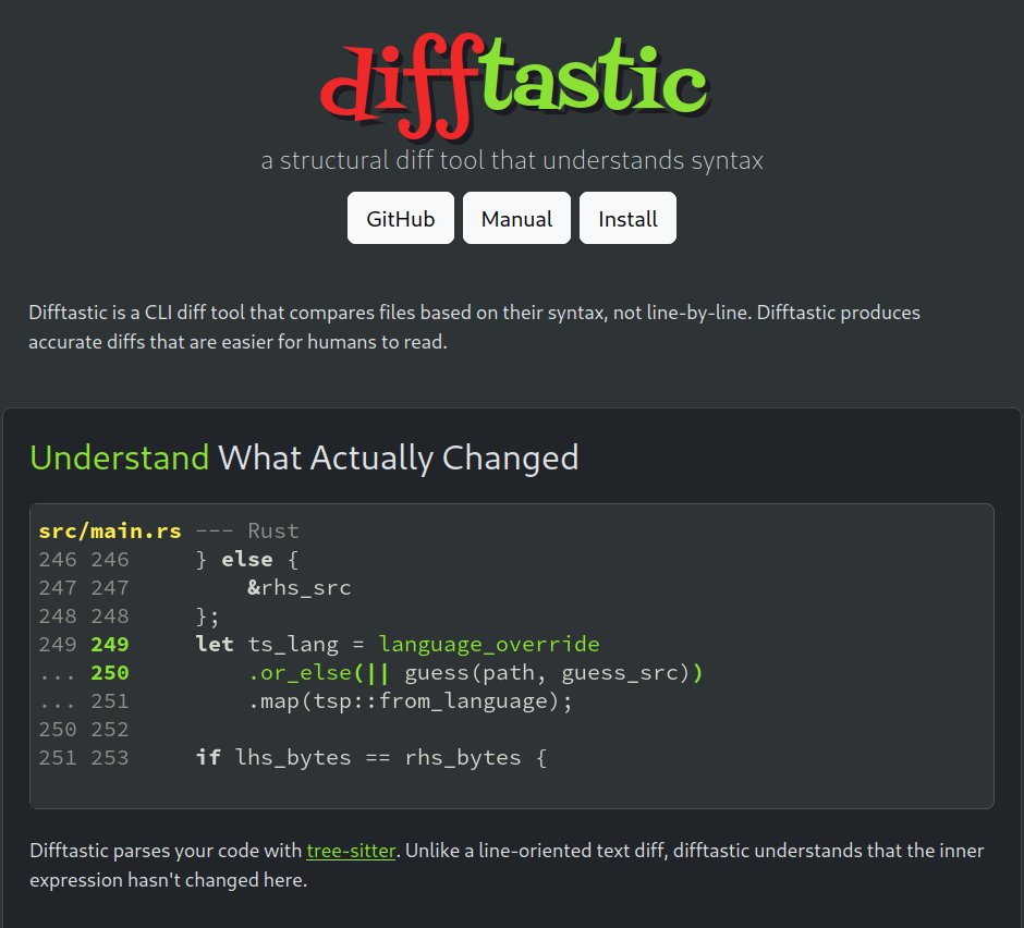 Difftastic now has its own homepage! I wanted to put together a set of screenshots that showed why you might like it.